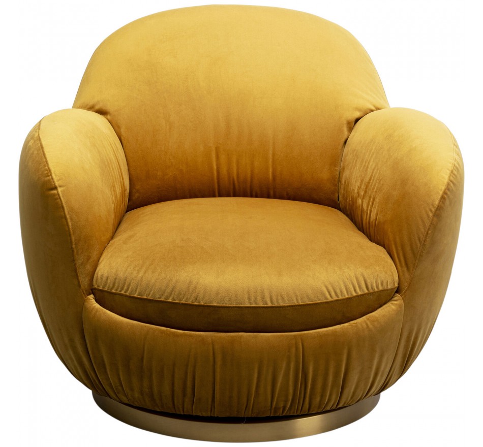 This yellow armchair brings a touch of sunshine to your space. Its rounded design evokes the retro aesthetic of years gone by. Mounted on a round golden base which allows it to swivel, this armchair combines elegance and functionality.
