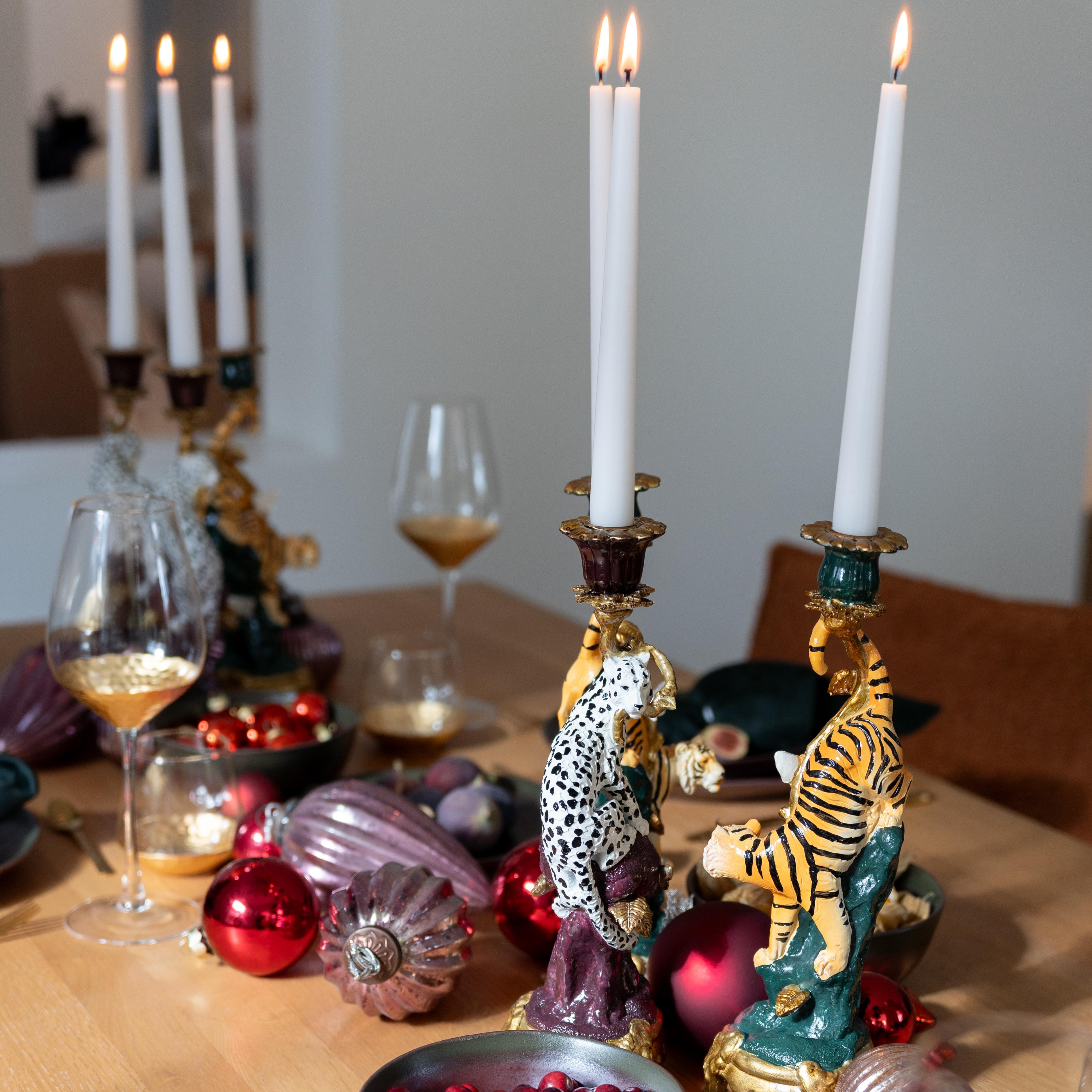 Ce bougeoir capte tous les regards avec son tigre gracieux. Habillé d’un vert foncé et rehaussé d’accents dorés, il insuffle à votre intérieur une touche exotique et luxueuse. Son design en fait une véritable oeuvre d’art fonctionnelle, idéal pour des bougies fines qui ajoutent hauteur et ambiance à votre décoration. Sur une table, un buffet ou en pièce maîtresse sur une étagère, ce modèle apporte une note audacieuse à votre espace.