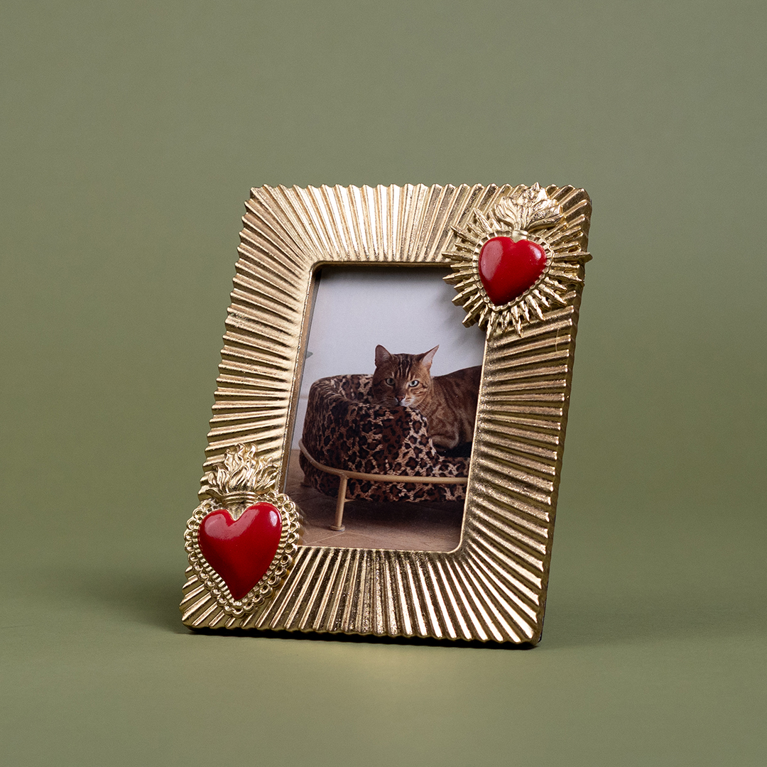 Ajoutez une touche de charme irrésistible à votre intérieur avec ce cadre photo au contour doré orné de cœurs rouges en relief. Plus qu’un simple support pour vos souvenirs, c’est un véritable objet décoratif plein de poésie et d’élégance. Romantique, raffiné et plein de caractère, il met en valeur vos photos tout en apportant chaleur et originalité à votre décoration. Idéal dans une chambre, un salon ou sur une console d’entrée, il attire tous les regards avec son design unique et ses finitions soignées. Un cadre qui fait battre les cœurs.