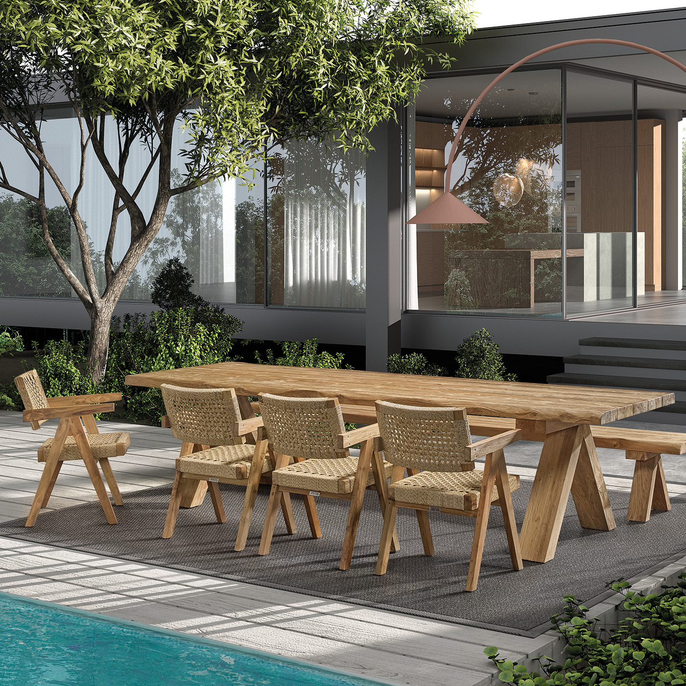 Cette chaise de jardin en teck recyclé allie durabilité et élégance naturelle. Son assise en corde tressée offre un confort aéré tandis que le dossier suspendu, soutenu uniquement par les accoudoirs, lui confère une silhouette légère et contemporaine.