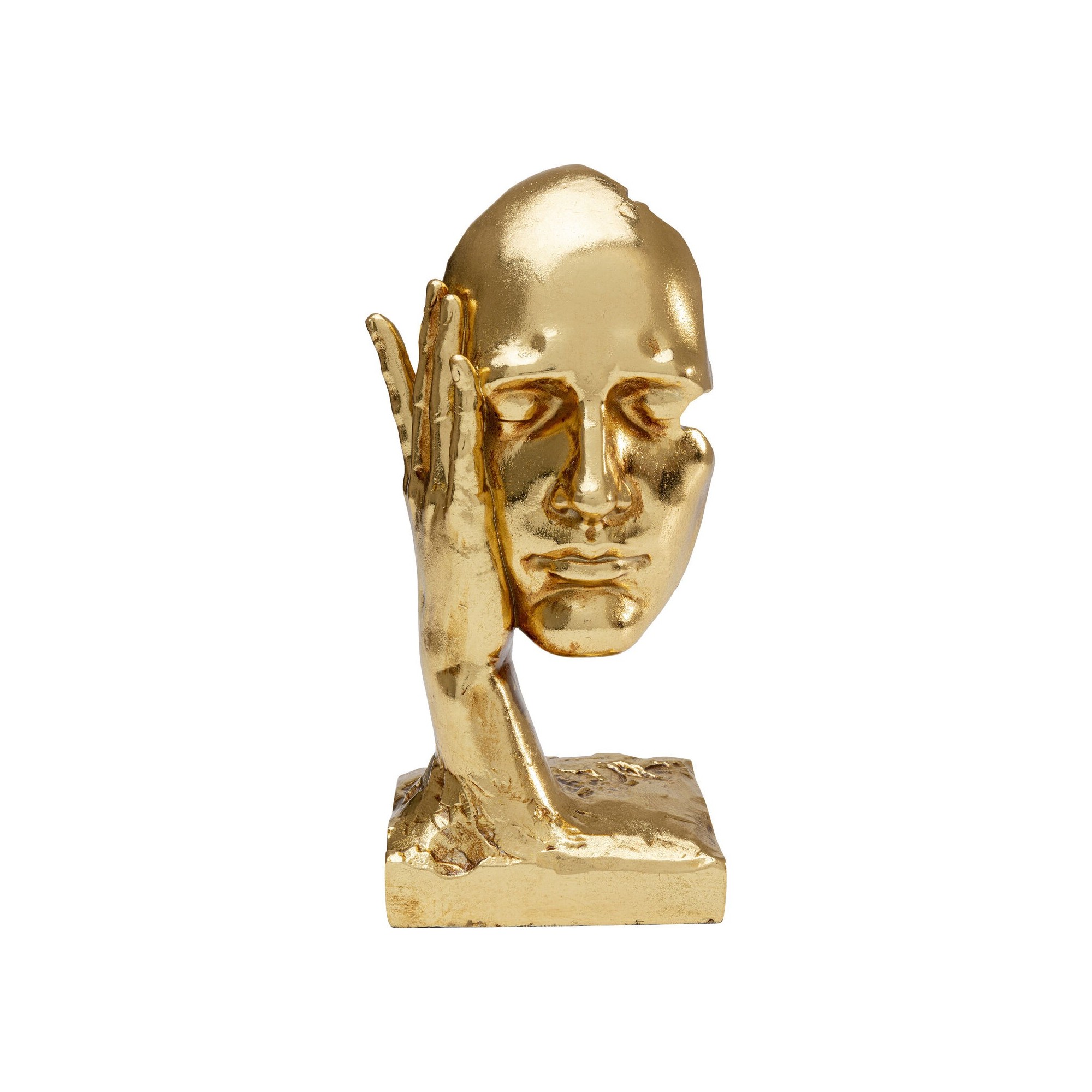 Ce visage doré en polyrésine, appuyé délicatement sur une main, associe art et modernité pour habiller vos étagères, consoles ou buffets.