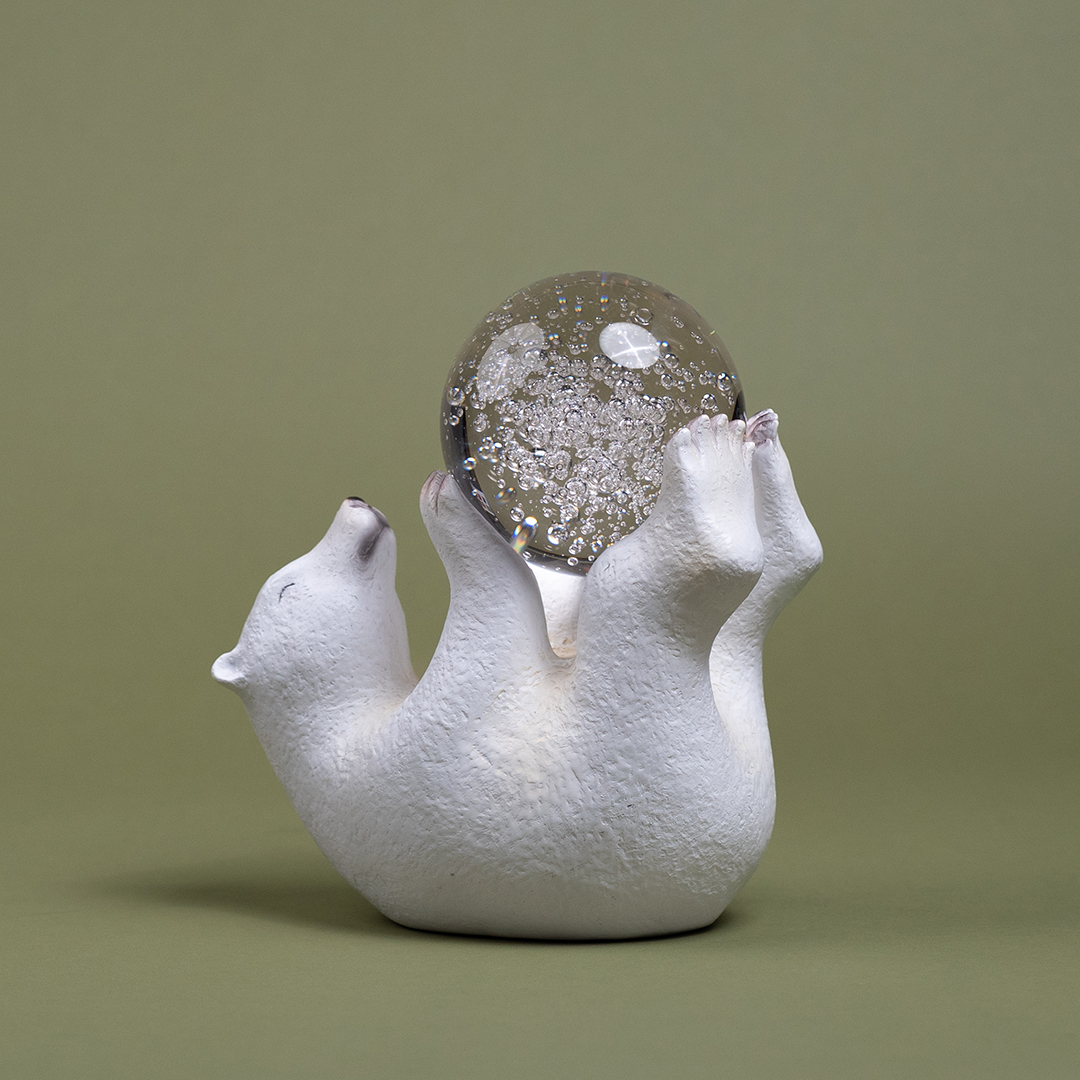 Cette décoration met en scène un ours polaire, allongé sur le dos, qui joue avec une sphère en verre en équilibre sur ses 4 pattes.