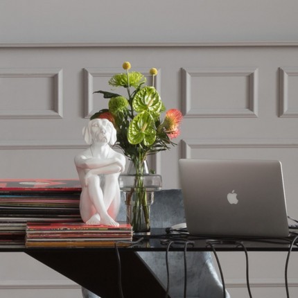 Cette statue représente une tête de chien sur un corps d'homme assis. Elle porte un collier avec des strass argent. Cette décoration a été créée en collaboration avec le couple d'artistes Australiens Gillie et Marc.