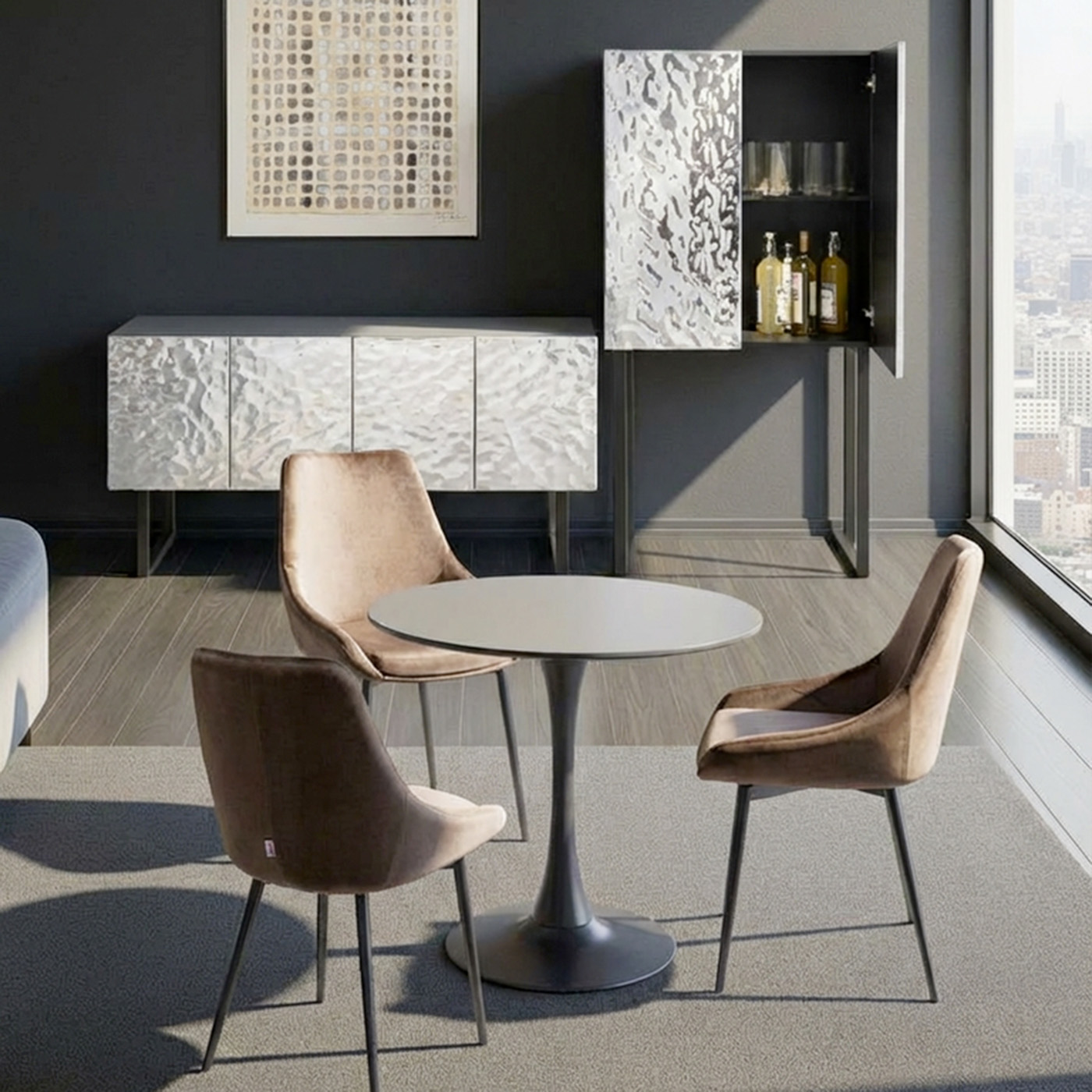 This bar unit with its resolutely modern design will bring an elegant and sophisticated touch to your living room. Its silver finish catches the light and lends the piece a graphic character. Both aesthetically pleasing and functional, it offers generous storage space while asserting a strong decorative personality.
