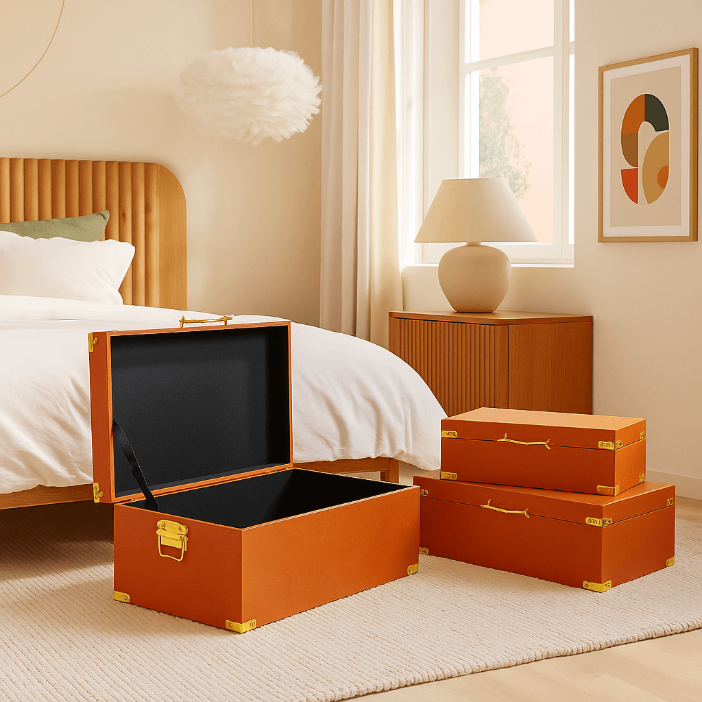 Add a vibrant touch to your space with our set of bright orange boxes. Their imitation reptile skin coating is accented by gold handles and corners.