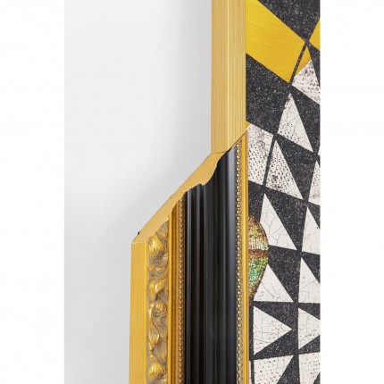 This large painting brings fantasy to your home with its quirky assemblage of Parisian monuments and hot air balloons around a woman's face. The yellow corners, the unstructured frame with mouldings combined with the hypnotic black and white patterns make this a piece of art that brings madness to your home.