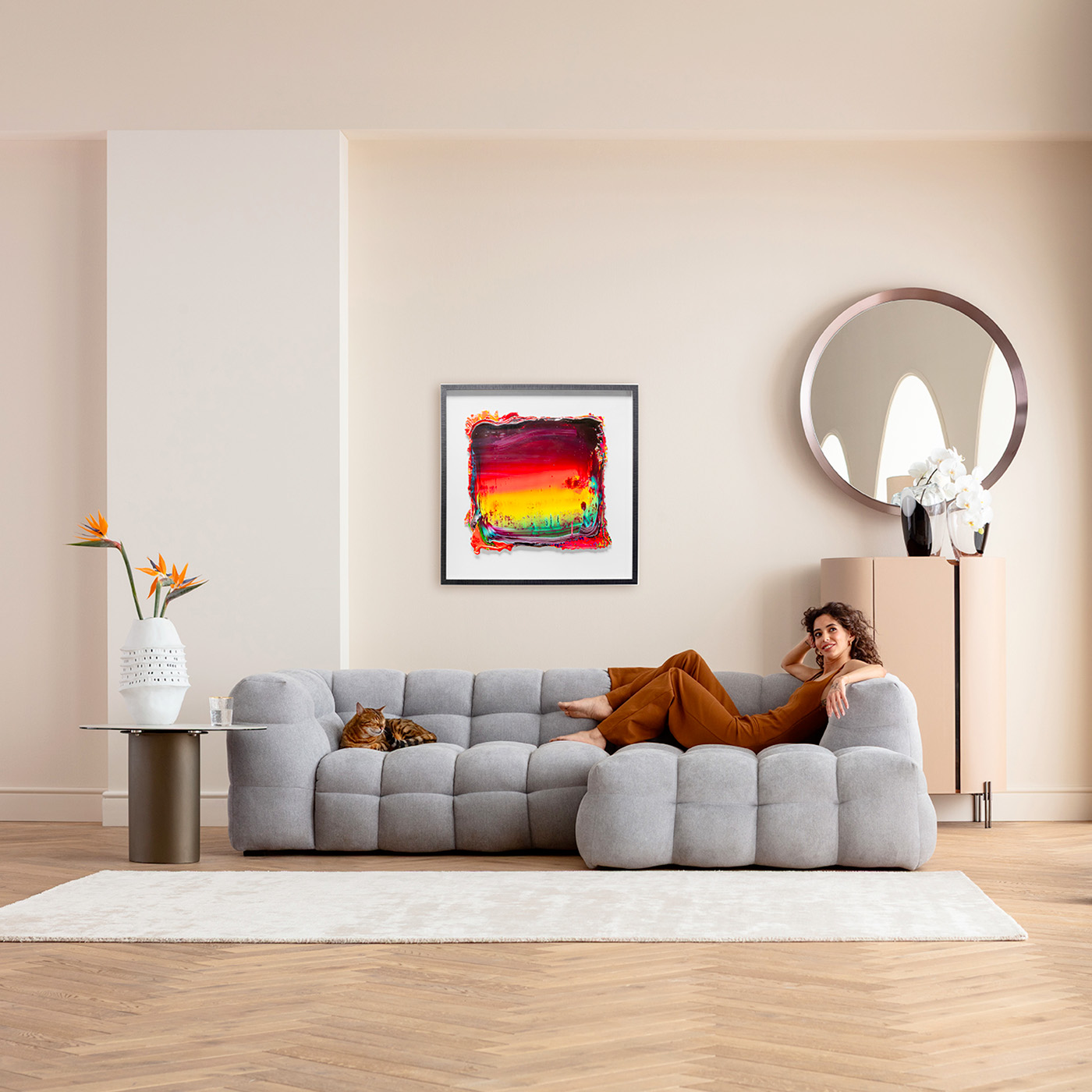 Bring warmth and energy to your interior with this framed abstract painting, featuring vibrant gradations of red, yellow and green. Its irregular textures and visual depth make it a unique piece, perfect for sublimating a modern space with bold elegance.