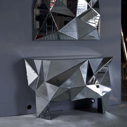 This designer console is covered with multiple mirrors for an avant-garde look. It impresses with its unstructured assembly. The mirrored faces are arranged like prisms, reflecting colored light.