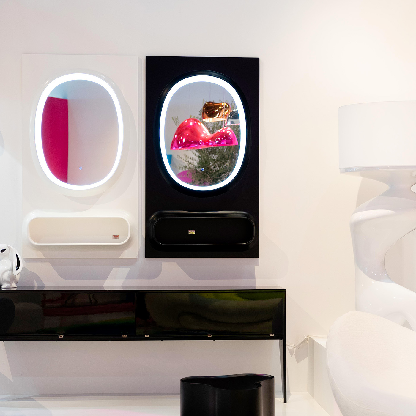 The "Fluid Realities" collection is the result of an exclusive collaboration between KARE and renowned designer Karim Rashid. With his unique stylistic language and visionary aesthetic, he creates furniture and lighting that are both futuristic and functional. This striking wall-mounted mirror with shelf features a powerful design and brings dynamism to any interior. Thanks to its integrated LED lighting, the mirror provides perfect illumination, ideal for modern rooms that need to be both functional and aesthetically pleasing.