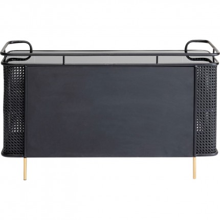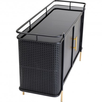 This sideboard offers a combination of glass and steel to bring a retro feel to your home. The legs are complemented by gold tips that add elegance. The sides are inspired by woven rattan to lighten the silhouette.