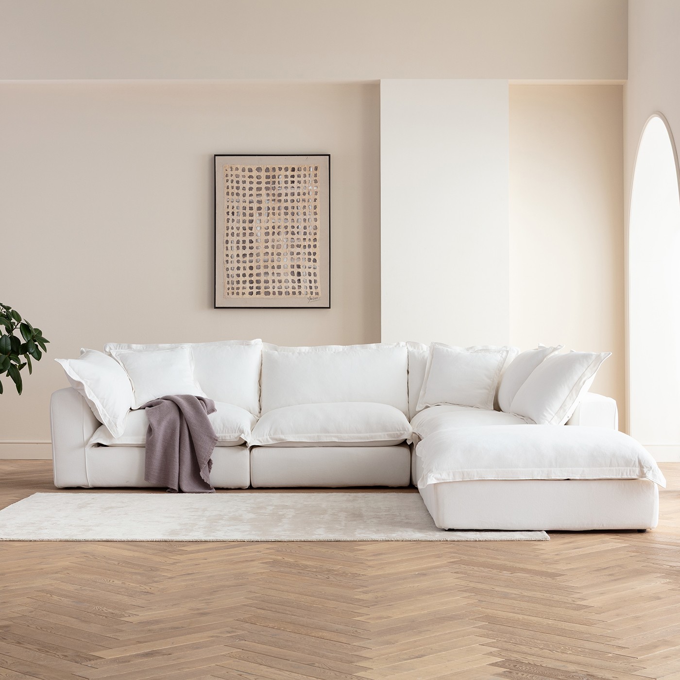 This white corner sofa combines comfort and elegance with its sleek design. Its backrest features 7 cushions of varying sizes, offering soft support and relaxed style. Ideal for creating a cosy, welcoming space!