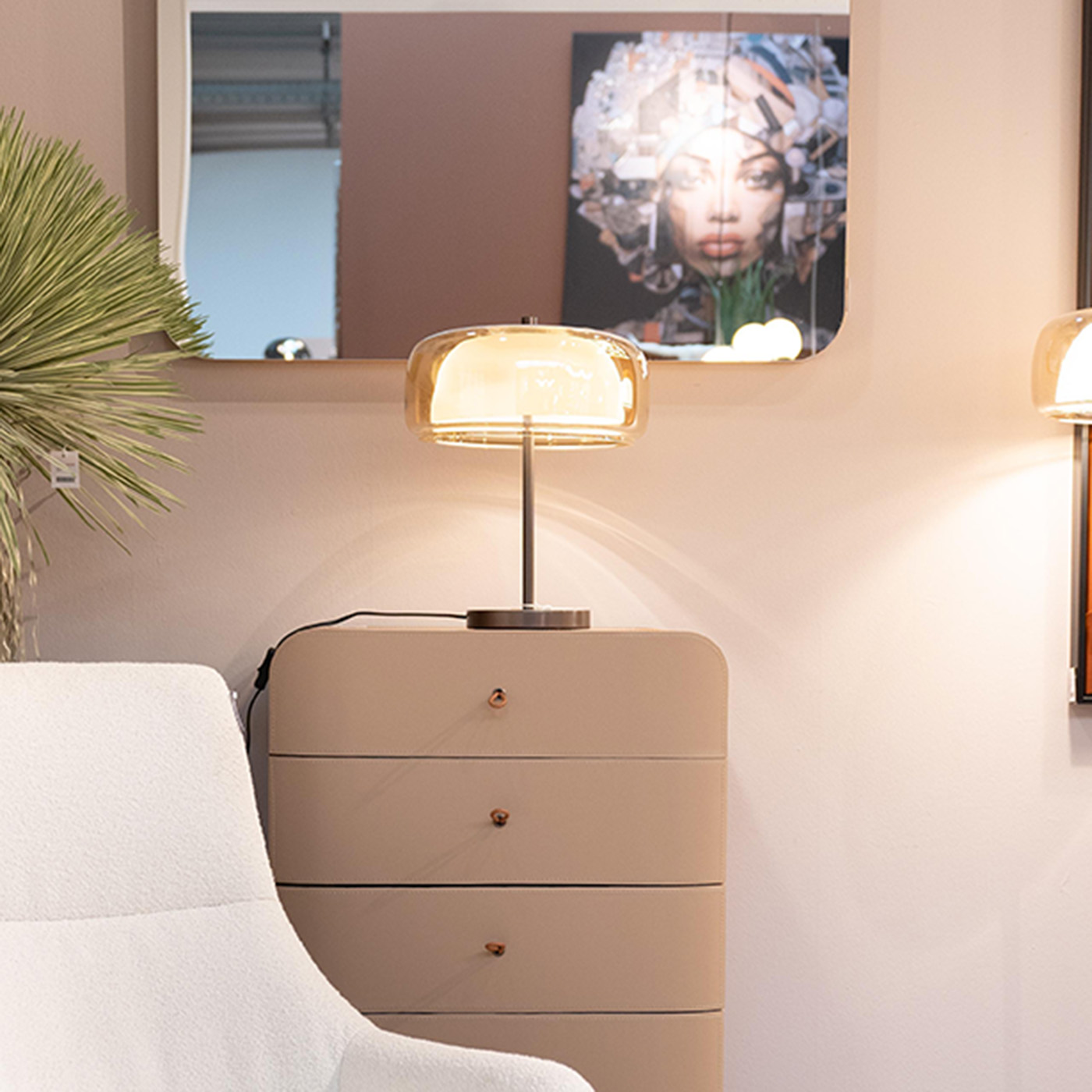 This elegantly designed lamp features a tinted glass shade with soft, rounded lines. It diffuses a warm light that creates a soothing ambience in your home. Its slender lacquered steel structure gives it a modern, refined look, ideal for accompanying a reading corner or living room.