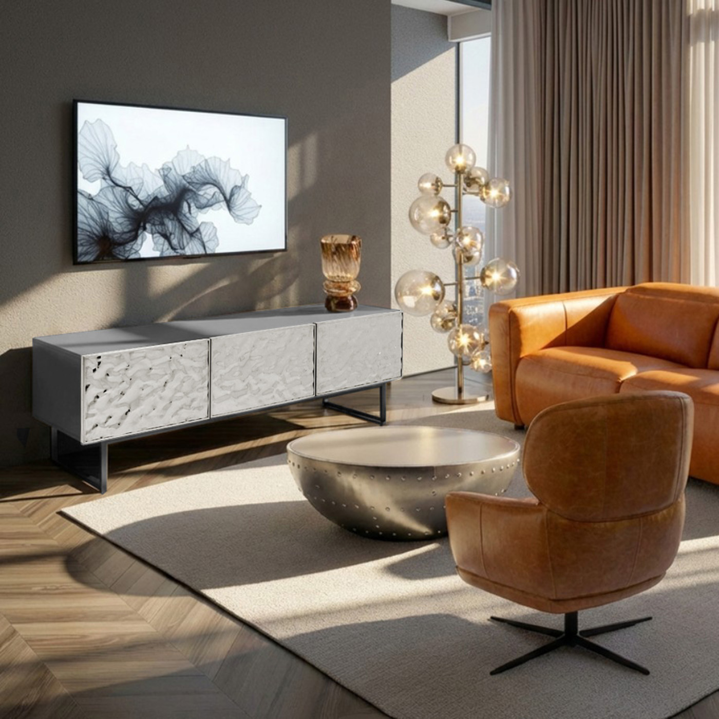 This TV stand with its resolutely modern design will bring an elegant and sophisticated touch to your living room. Its silver finish catches the light and gives it a graphic character. Both aesthetically pleasing and functional, it offers generous storage space while asserting a strong decorative personality.