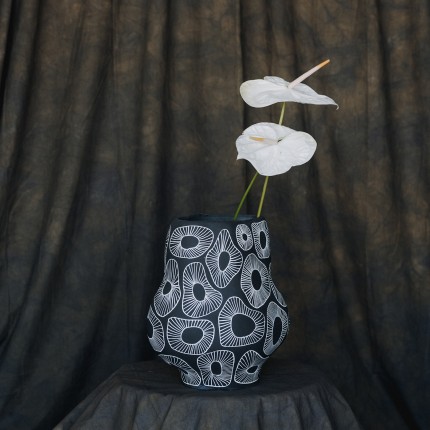 This grey vase is distinguished by its organic shape and abstract white anemone designs.