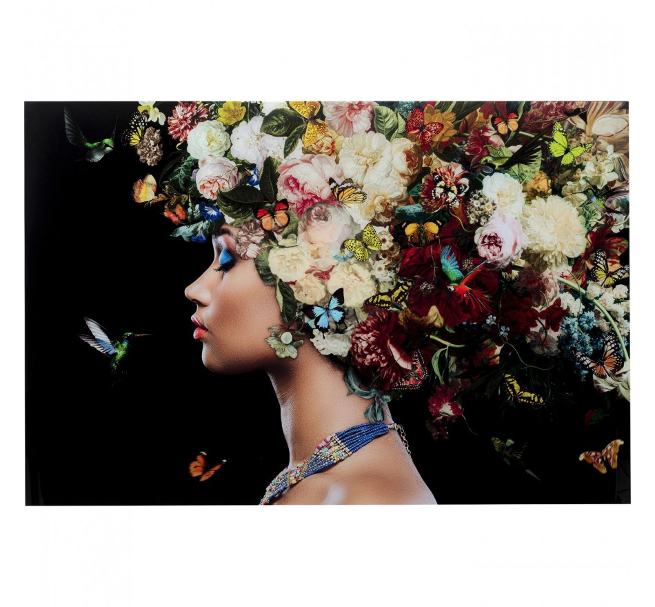 Plongez dans un monde de fantaisie avec ce tableau en verre qui représente une femme coiffée d'une nuée de papillons et d'un bouquet de fleurs. Cette déesse de la nature apporte de la couleur et de la douceur à votre intérieur.