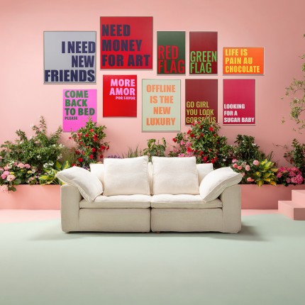 Ce tableau audacieux présente un fond rose vibrant sur lequel est inscrit "Come back to bed please" en lettres vertes. Il évoque avec humour l'appel irrésistible de la couette.