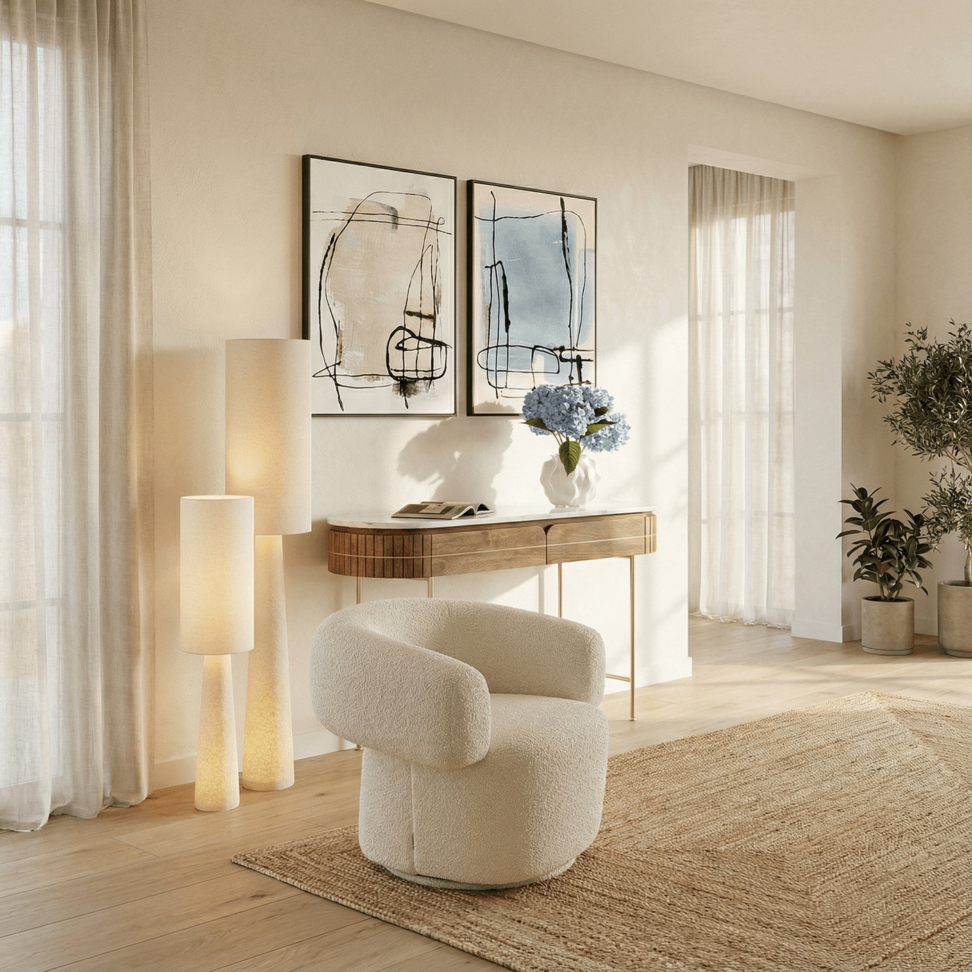 Ce tableau abstrait se distingue par ses nuances aux tons sereins et apaisants tandis que les lignes noires fluides apportent du dynamisme.