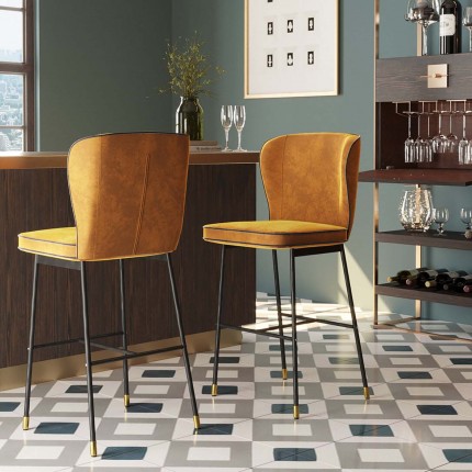 Ce tabouret de bar trouve sa place dans un intérieur rétro grâce à son assise toucher velours de couleur ocre alliée à un piétement en acier noir avec les extrémités dorées. Il se complète avec la chaise de la même collection pour harmoniser votre cuisine et votre salle à manger.
